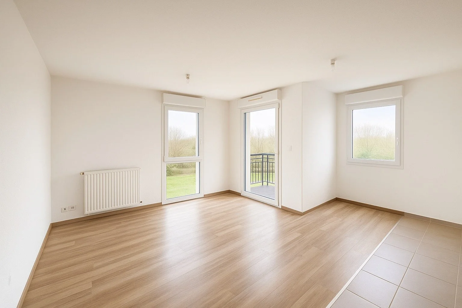 Appartement vide avec fenêtres, porte-fenêtre et vue sur la nature, sol en bois clair et murs blancs.